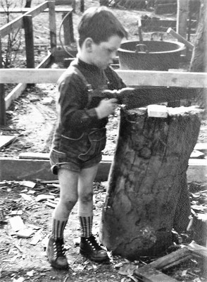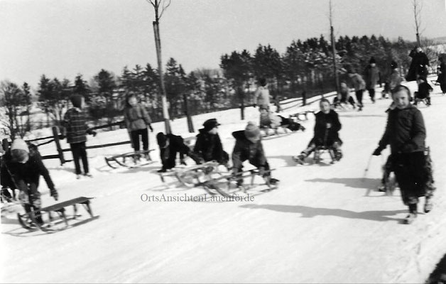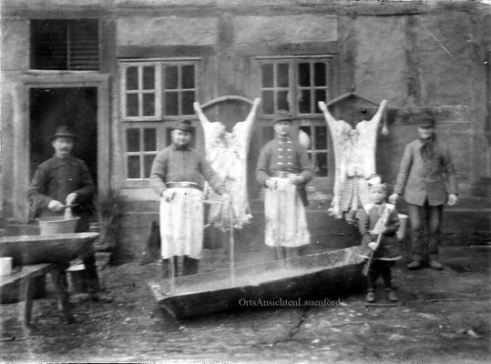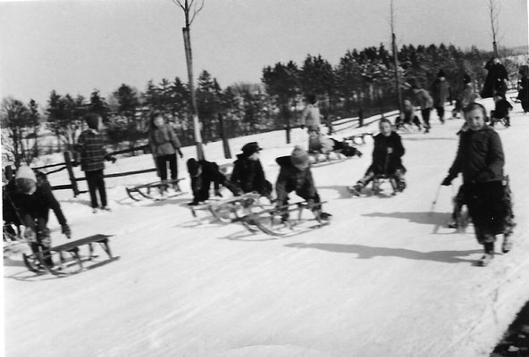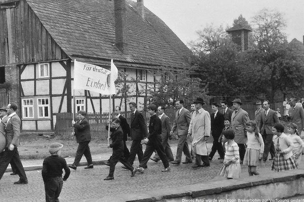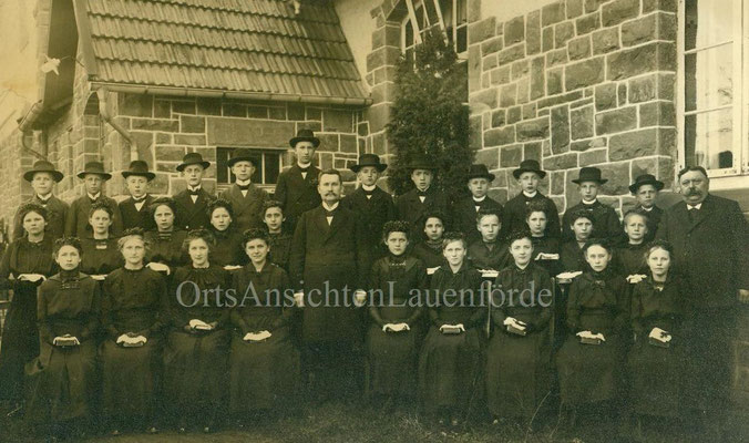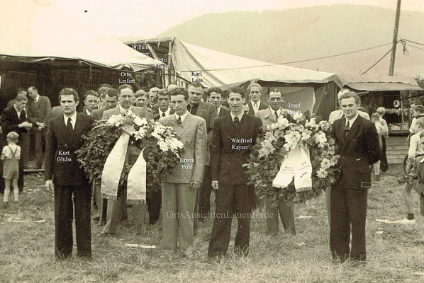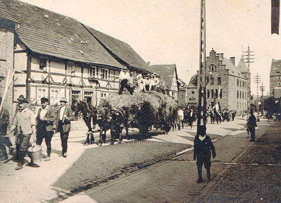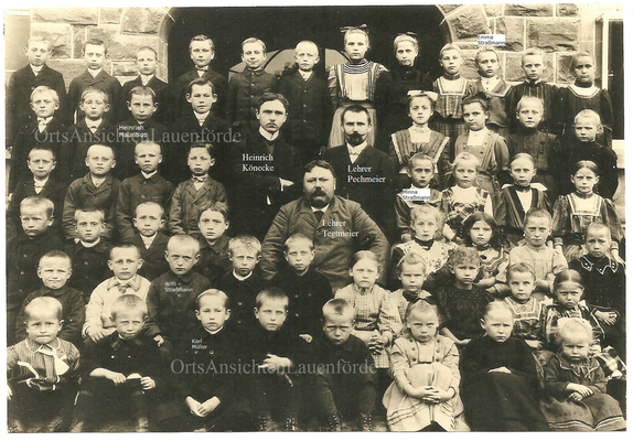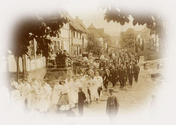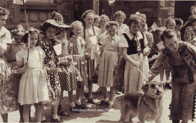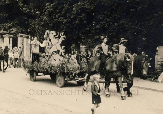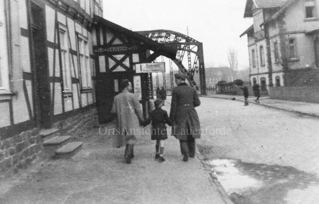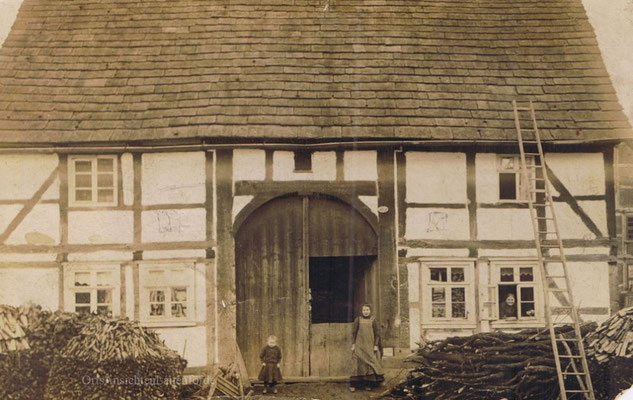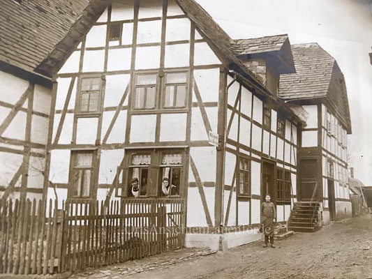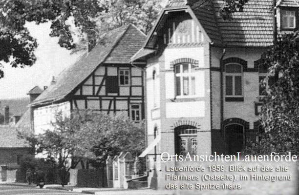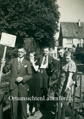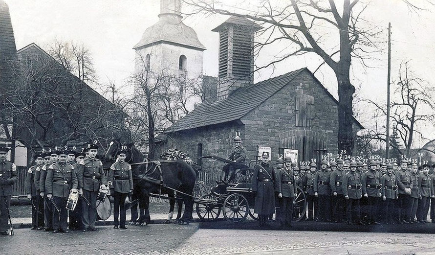 Das alte Spritzenhaus mit der damaligen Feuerwehr und Gendarm Wollersen. Im Spritzenhaus parkte zunächst die Feuerwehrspritze, nach dem Umzug der Feuerwehr, wurde dort der Leichenwagen der Gemeinde untergebracht. Erinnerung, als Kinder haben wir dort gespielt, sehr hoher Gruselfaktor! :-)