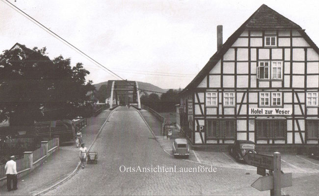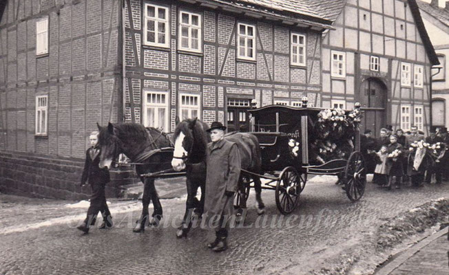 Der alte Leichenwagen, der noch von zwei Pferden gezogen wurde. Diese Fotos entstanden Mitte der 50er Jahre - Lange Strasse/Weserbrücke. Diese Fotos wurden uns von den Angehörigen zur Verfügung gestellt und zur Veröffentlichung freigegeben !
