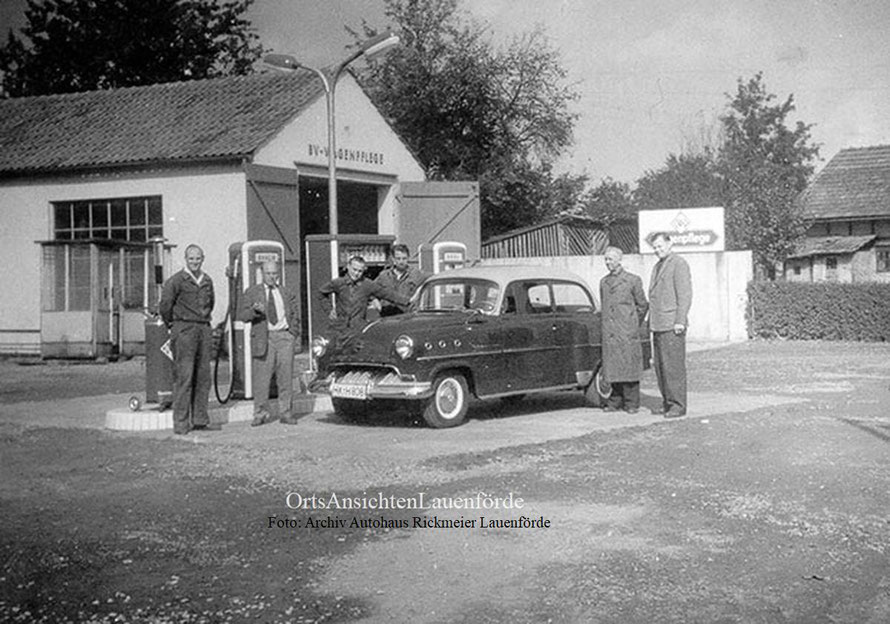 1955.Einweihung der Aral Tankstelle. Zweiter von rechts Albert Rickmeier, Dritter von rechts Alfred Rickmeier. Die anderen Herren kamen von Aral aus Bochum. Damals gab es noch kein Tankstellendach, tanken mit Bedienung, Reifendruck- und Ölkontrolle waren damals selbstverständlich.